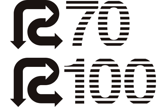 その際、制作物に古紙パルプ70%以上使用の再生紙には「R70」マーク、古紙パルプ100%使用の再生紙には「R100」のリサイクルマークを表示させることを提唱します。